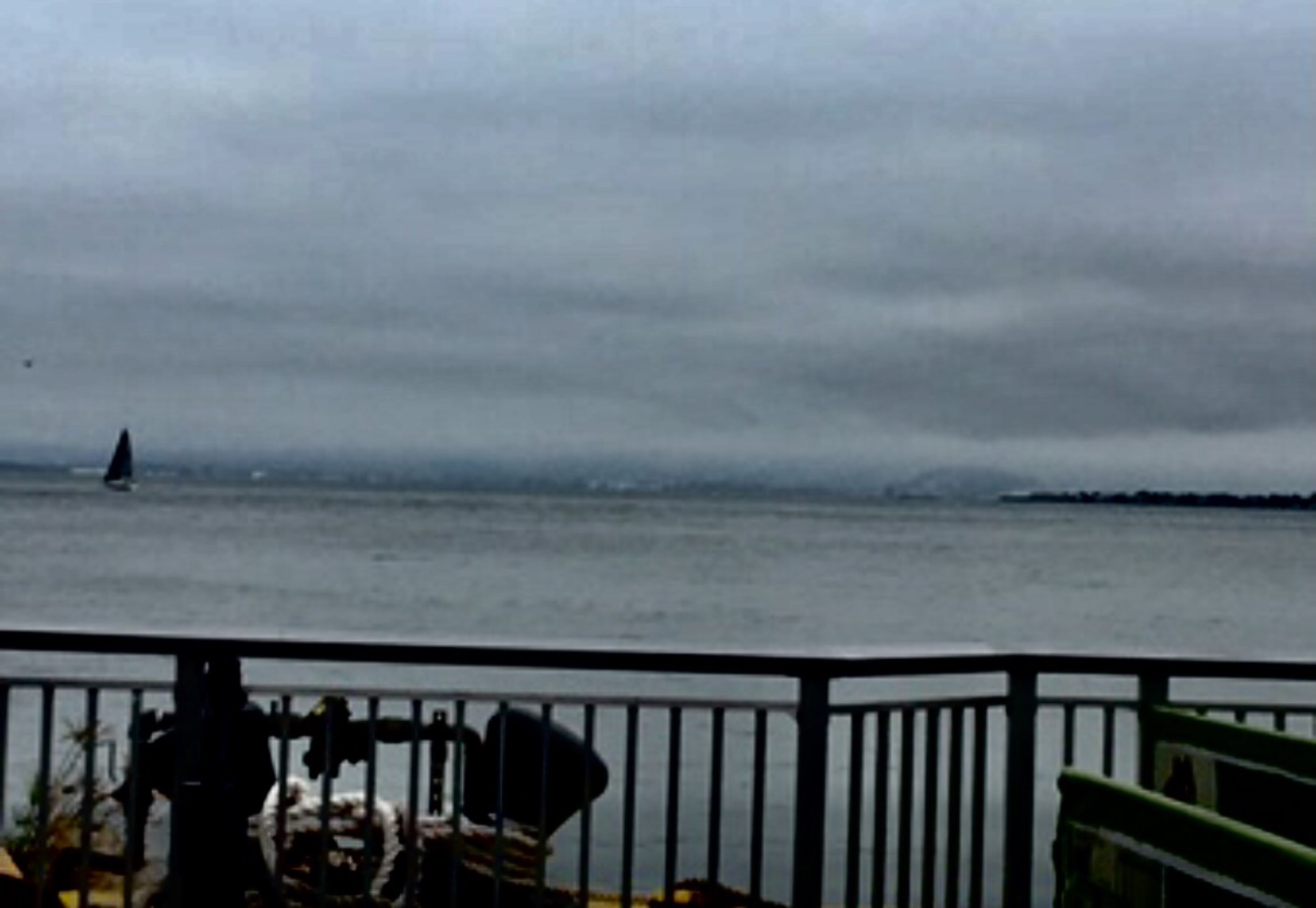 Sailboat on the left, Alcatraz Island on the right.